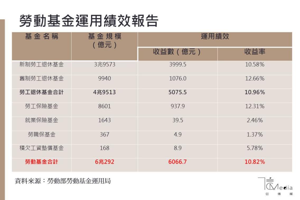 勞動基金規模為6兆292億元,其中包含規模約3兆9573億元的新制勞工退休基金、舊制勞退基金規模則9940億元;接著勞保基金規模8601億元、就保基金規模1643億元,勞職保基金以及積欠工資墊償基金規模則分別為367及168億元。