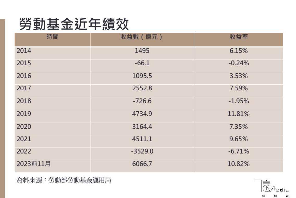 隨著台美股市在2023年11月強彈,連帶也拉抬勞動基金績效,根據勞動基金運用局最新公告,截至2023年11月底勞動基金收益數為6066.7億元、收益率10.82%,預計2023年全年收益數將有望再創下新高紀錄。