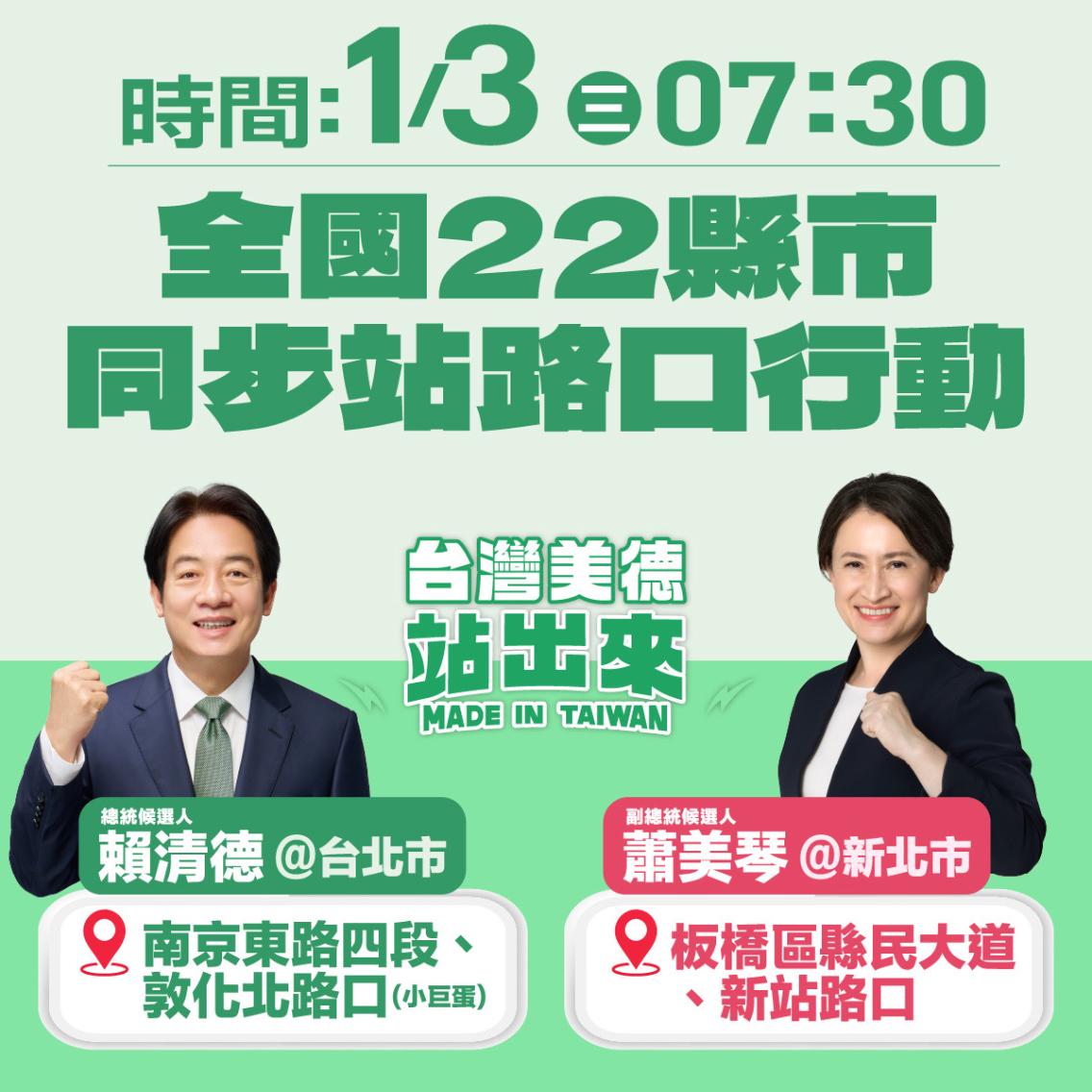 郭雅慧說,大車掃活動則是由賴清德、蕭美琴兩人分進合擊,賴清德會自1月8日由南而北出發,蕭美琴則由北而南開始,最後都在1月12日分別在新北及台北市合體,共同進行車掃活動。