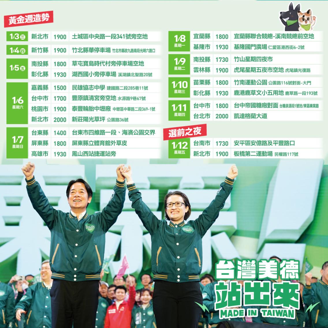 郭雅慧說明,從明日晚間開始,將從晚上7點的新北首場開始,在各縣市進行為期10天的黃金週大造勢,最後在1月12日的選前之夜先前往賴清德的從政起點與蕭美琴的故鄉台南,再回到新北市,舉行共21場的大型造勢。
