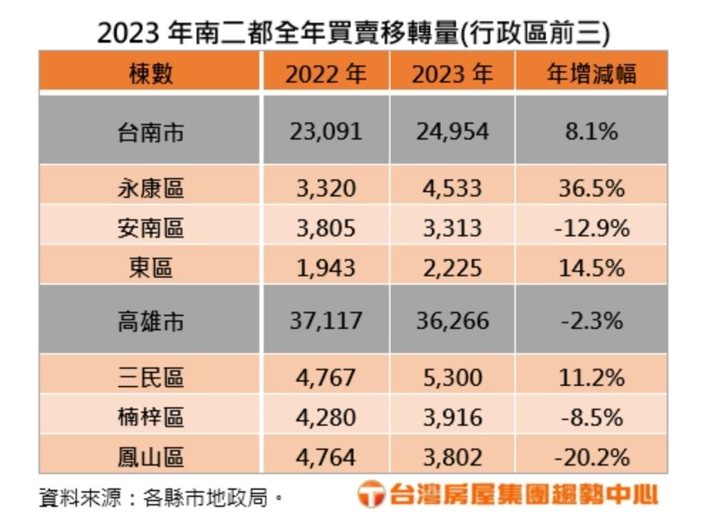 至於台南地區,2023年全年買賣移轉棟數前三大行政區,永康區高人一等以4533棟居冠,年增36.5%,為全市唯一突破4千棟的熱區,其次為安南區,以3313棟居次,年減12.9%,東區以2225棟位居第三,年增14.5%。