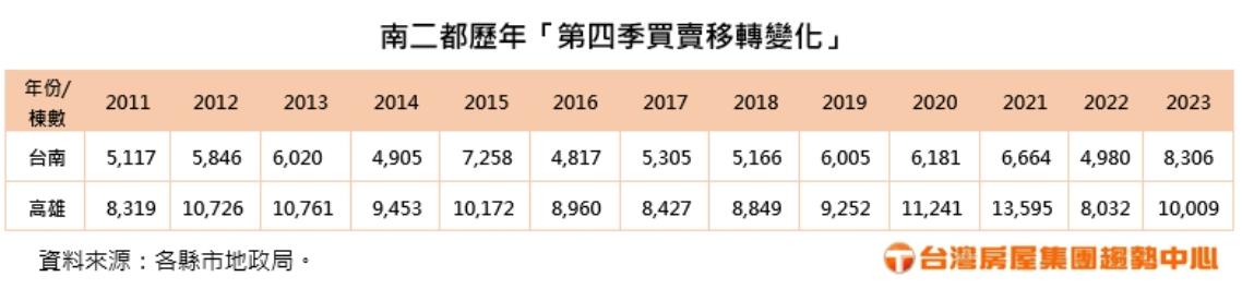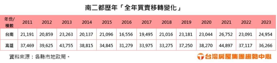 累計台南高雄2023年全年度買賣移轉總棟數,台南全年共為2萬4954棟,雖未超越2021年全年歷史最高2萬6752棟紀錄,仍締造出史上次高量。而高雄全年買賣移轉總棟數為3萬6266棟,比2022年略少851棟,為近五年表現最冷的一年。