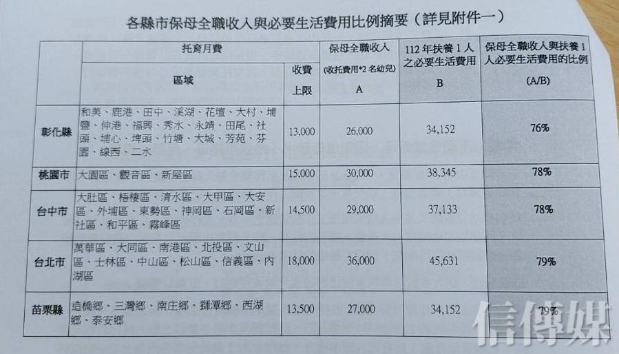 吸引嬰幼兒照顧人才投入保母工作的關鍵之一,那就是工作收入必須足以育兒養家。托育盟發言人黃喬玲說明,保母薪水為「『托育月費』乘於『收托兒童人數』」,若用各縣市居家托育服務收費基準以及司法院必要生活費用相互對比,計算後可發現,全台各縣市保母的「保母全職收入」(將收托2位幼兒視為全職保母)能夠扶養1名子女的縣市,只有新竹市、金門縣、連江縣,其他縣市居家保母的全職收入皆不足以養家育兒,尤其台北、台中等5縣市的部分區域,落差更是嚴重。