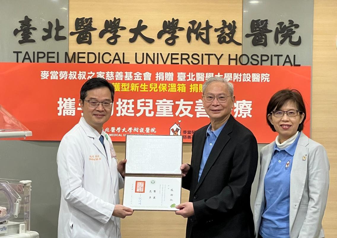 新生兒人數逐漸遞減,早產兒比例未減反增。為了細心呵護每一個新生命,麥當勞叔叔之家慈善基金會今(4)日捐贈2台「重症加護型新生兒保溫箱」予臺北醫學大學附設醫院,攜手打造早產兒的第一個家,盼能讓這群巴掌天使從出生的那一刻即獲得最妥善的照護,在愛的呵護下平安長大。