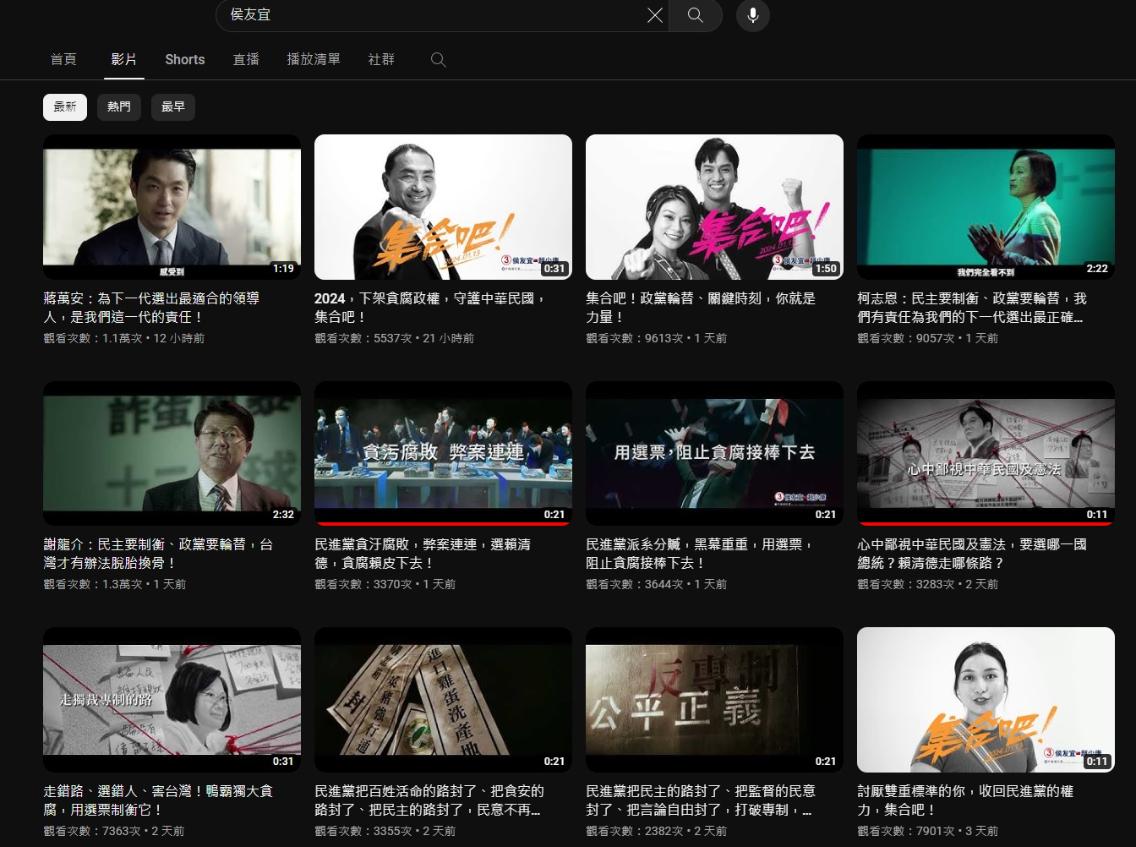 不讓「賴蕭配」專美於前,相較「在路上」廣告長達4分鐘,「侯趙配」則狂發幾十則短影音廣告,主題包括「集合吧」,用民進黨弊案來召喚選民投票,時長均11秒;另外也包括台北市長蔣萬安、不分區立委柯志恩、謝龍介推薦侯友宜,時長最多2分鐘。