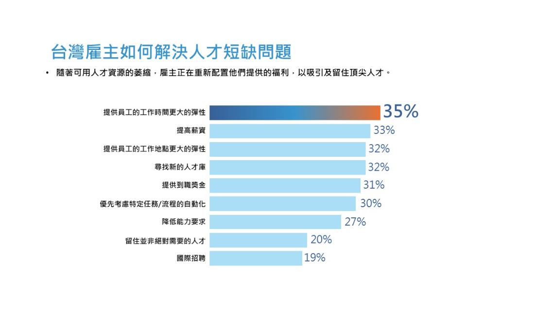 本次也針對雇主應對人才短缺採取的策略進行調查。前三名分別是提供員工工作時間更大的彈性(35%)、提高薪資(33%)、提供員工工作地點更大的彈性(32%)。葉朝蒂指出,從數據可以看到台灣企業為了攬才,除了傳統的薪資待遇外,也開始著墨在提供彈性的工時、地點等福利,這代表除了希望能招募到關鍵人才外,同時也希望留下既有的優秀人才。