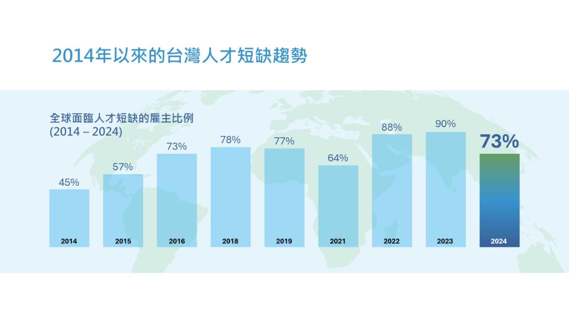 本次調查針對41個國家及地區、40,000名以上雇主進行訪問,其中包括630名台灣企業雇主。萬寶華台灣人才派遣事業總經理葉朝蒂指出,人才短缺雖一直是全球普遍現象,不過因為近年AI興起,短缺的技能類別與之前有所不同,特別是人力資源類技能開始受到雇主重視,而如何培訓員工利用AI人工智慧也成為重要挑戰。