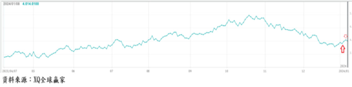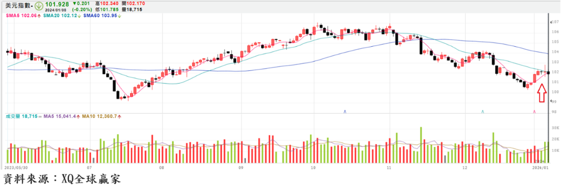 受2024年美國首週公布的就業數據,包括初領失業救濟金人數及新增非農就業人口數,同步優於預期,美國10年期公債殖利率自12月最低點3.78%,反彈至1月5日最高點4.099%,美元指數自100.62反彈至103.1,美股四大指數2024年首周同步回檔,台股亦呈現漲多回檔走勢。