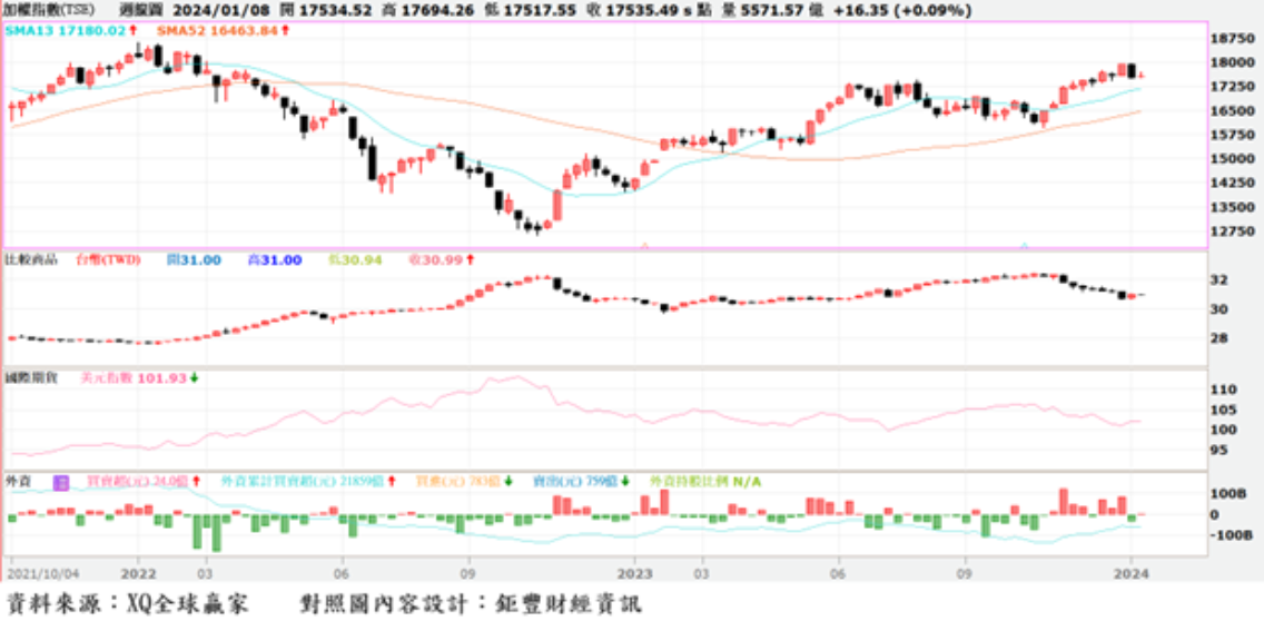 2024年首周美元指數反彈1.06%,台幣由升轉貶0.95%,外資賣超台股295億,台股單周下跌2.3%,明顯低於費半指數跌幅的5.8%,但台股面臨連續兩個月上漲後的回檔整理壓力仍不低。