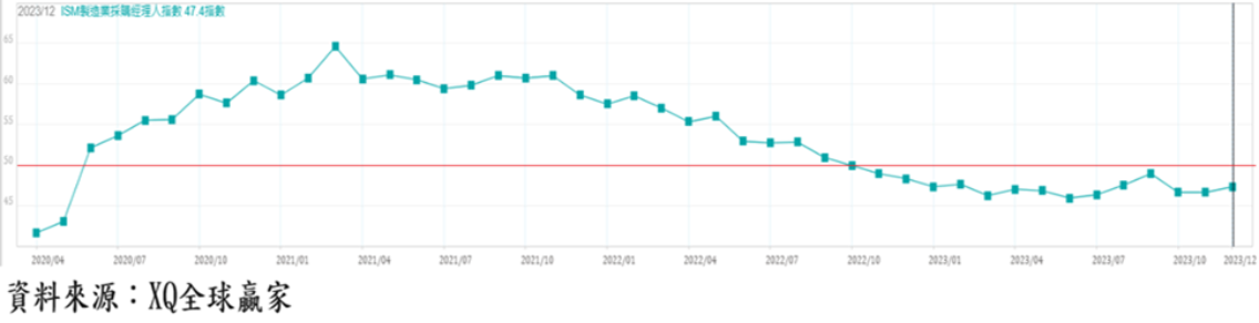 美國12月ISM製造業採購經理人指數自11月的46.7小幅上升至47.4,連續第14個月低於景氣擴張與收縮臨界點,顯示美國製造業景氣依舊處於收縮狀態。
