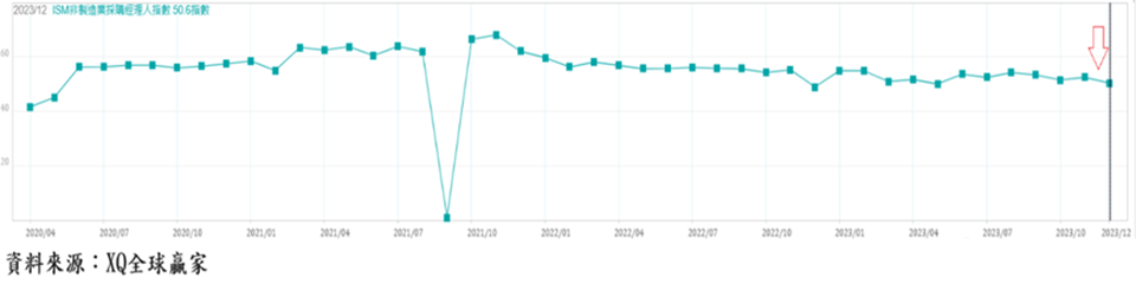 美國ISM非製造業採購經理人指數12月自11月的52.7下降至50.6,連續12個月高於景氣擴張與衰退臨界點50,但創近7個月最低點,整體服務業產值佔美國GDP比重超過八成,服務業維持景氣擴張狀態,支撐美國總體經濟避免走入衰退窘境,但擴張力道稍嫌偏弱。