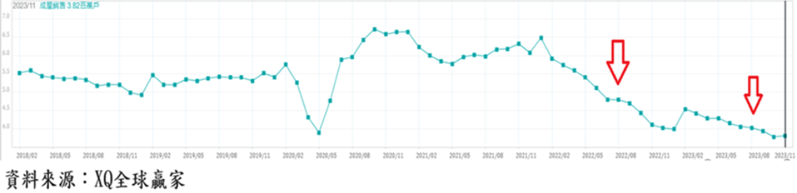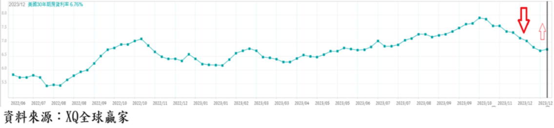 金融海嘯之前,美國30年期房貸2006年最高約6.8%,占美國房市成交量約85%的成屋銷售量年率戶數從720萬戶,下降至2008年的377萬戶,降幅約48%。2023年10月30房貸利率最高點約7.9%,11月回落至7.37%,12月進一步下降至6.71%,占整體房屋成交量約85%的成屋銷售量年率戶數從673萬戶,下降至2023年10月的379萬戶,降幅約44%,與金融海嘯之前的景況已相當接近,2023年11月成屋銷售年率戶數小幅上升至382萬戶,成屋銷售量仍顯冷淡。
