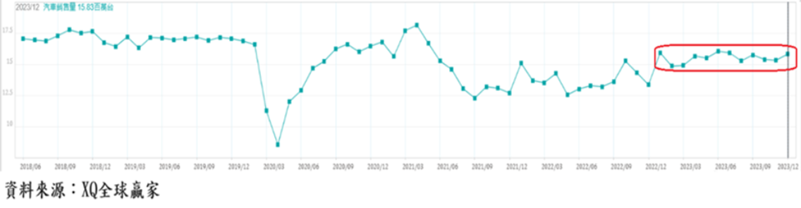 12月汽車年率銷售量為1580萬輛,月增3.27%,高於2022年同期的1340萬輛,年增17.9%,連續第17個月正成長,汽車業景氣維持復甦態勢,但成長動能仍呈溫和狀態,處於長期高檔的貸款利率造成車貸族沉重負擔,對汽車業景氣造成負面影響。