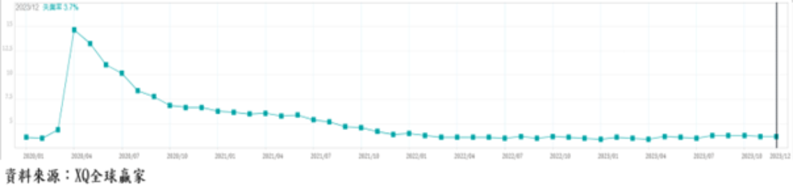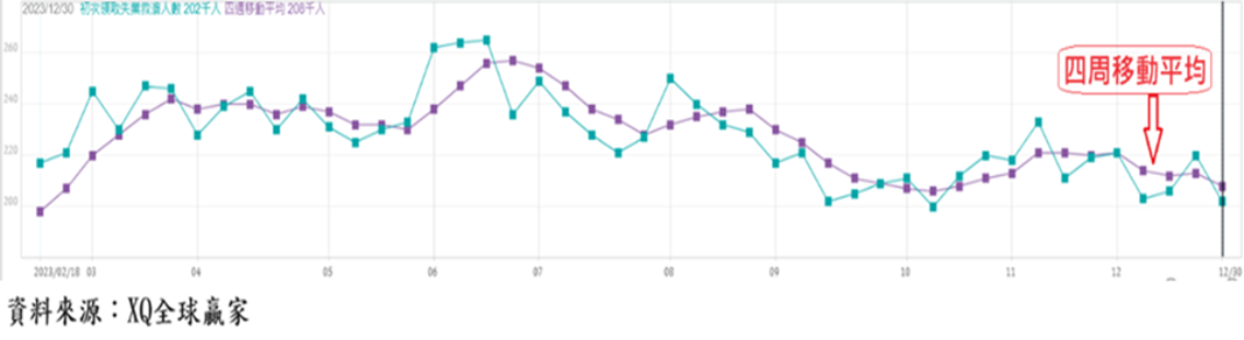 截至12月30日止的美國單周初領失業救濟金人數下降至20.2人,仍維持在長期低檔區,初領失業救濟金四周移動平均數自前周的21.3萬人,下降至20.8萬人,創近10周最低點,亦維持在長期的低檔區。連續請領失業救濟金人數自前周的188.6萬人,回落至185.5萬人。