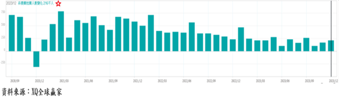 12月失業率3.7%月與10月持平,維持在5個月最低點。12月每小時薪資年增率4.1%高於市場預期的3.9%,亦稍高於11月的修正值4.0%,每小時薪資年增率自2022年3月的5.92%,處於緩步下降趨勢之中尚未改變。單月非農就業人口意外明顯優於預期,再度讓市場對Fed降息的路徑產生懷疑氣氛。