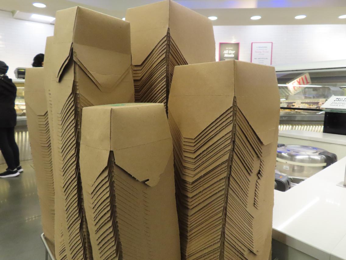 在曼哈頓,所有超市賣場的熟食區,都會有店家準備好的各種餐具,包括紙餐盒、紙碗、塑膠盒、塑膠刀叉湯匙等等。盛裝熱食或沙拉通常使用紙餐盒,盛裝水果大多就是用塑膠盒。