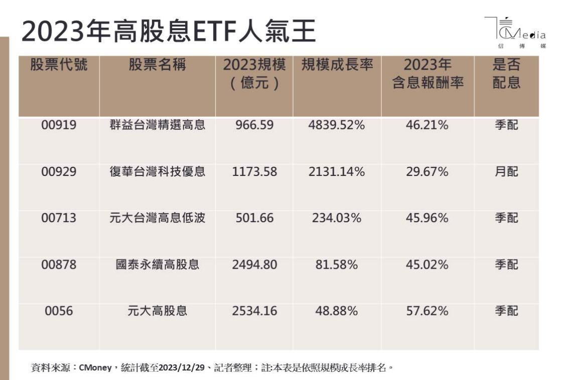 觀察去年高股息ETF的規模人氣王,若以成長率來看,群益台灣精選高息(00919)因連續3次配息率超過10%,帶動規模年成長率高達4839.52%,也就是成長48倍,無疑是2023年高股息ETF規模成長最高的一檔;而今年初該檔ETF規模也順利衝上千億元,成為第5檔千億台股ETF。
