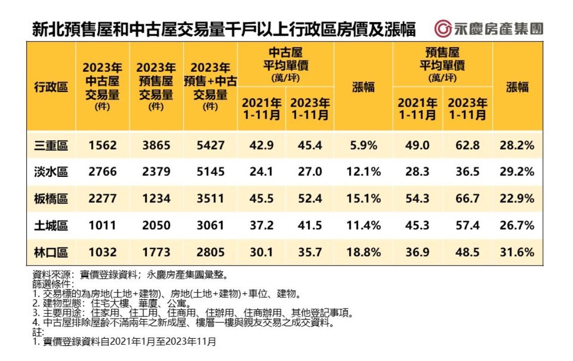 新北五大交易區預售屋漲幅均逾二成,林口預售帶動中古房價表現最亮眼