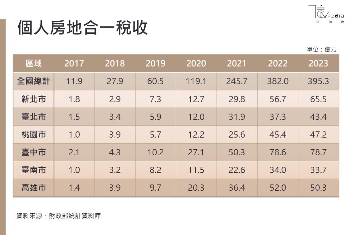根據財政部統計資料庫資料顯示,個人房地合一稅年年攀升,2018年僅27.9億元,2021攀升到245.7億元,2022年更一舉衝高到382億元,2023年則寫下歷史新高的395.3億元,反映適用房地合一的件數越來越多,同時房價大漲也帶動稅收增加。