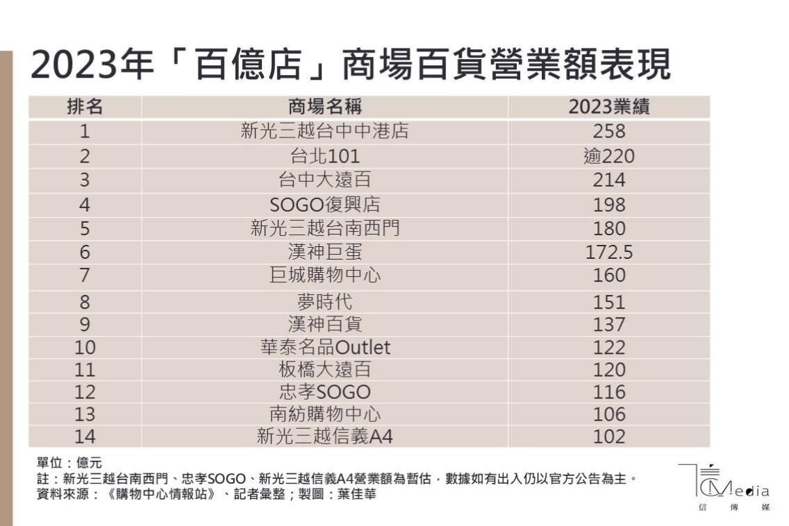 另外,《購物中心情報站》網站也預估,2023年營業額超過100億元的商場百貨共有14家,其中3家超過200億元,而首次入榜「百億俱樂部」的商場百貨,則分別是南紡購物中心和新光三越信義A4。