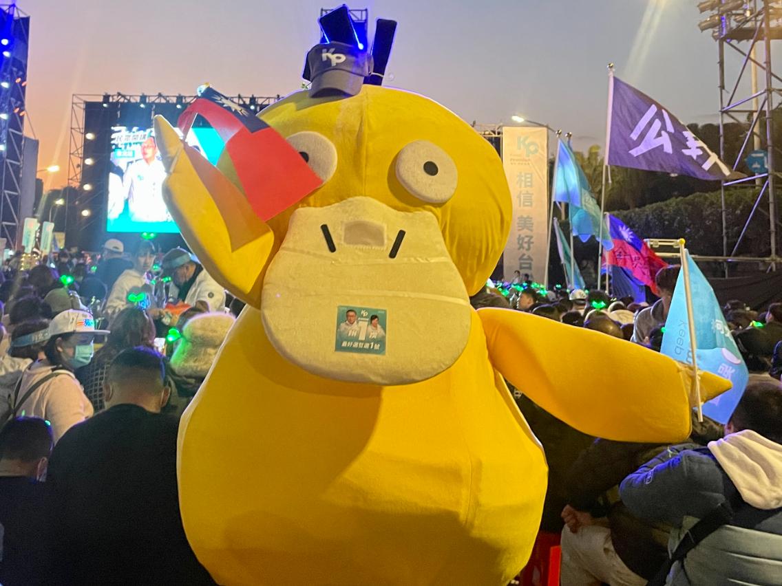 現場下午4點開放進場,但支持者早已排成一條又一條的超長隊伍。穿著可達鴨布偶裝的24歲草屯陳先生向《信傳媒》透露,自己下午1點就到現場排隊,希望可以在最後關頭,透過可達鴨布偶裝替柯文哲增加曝光度,並向柯文哲喊話「只要持續做對的事,大家都會支持你」。