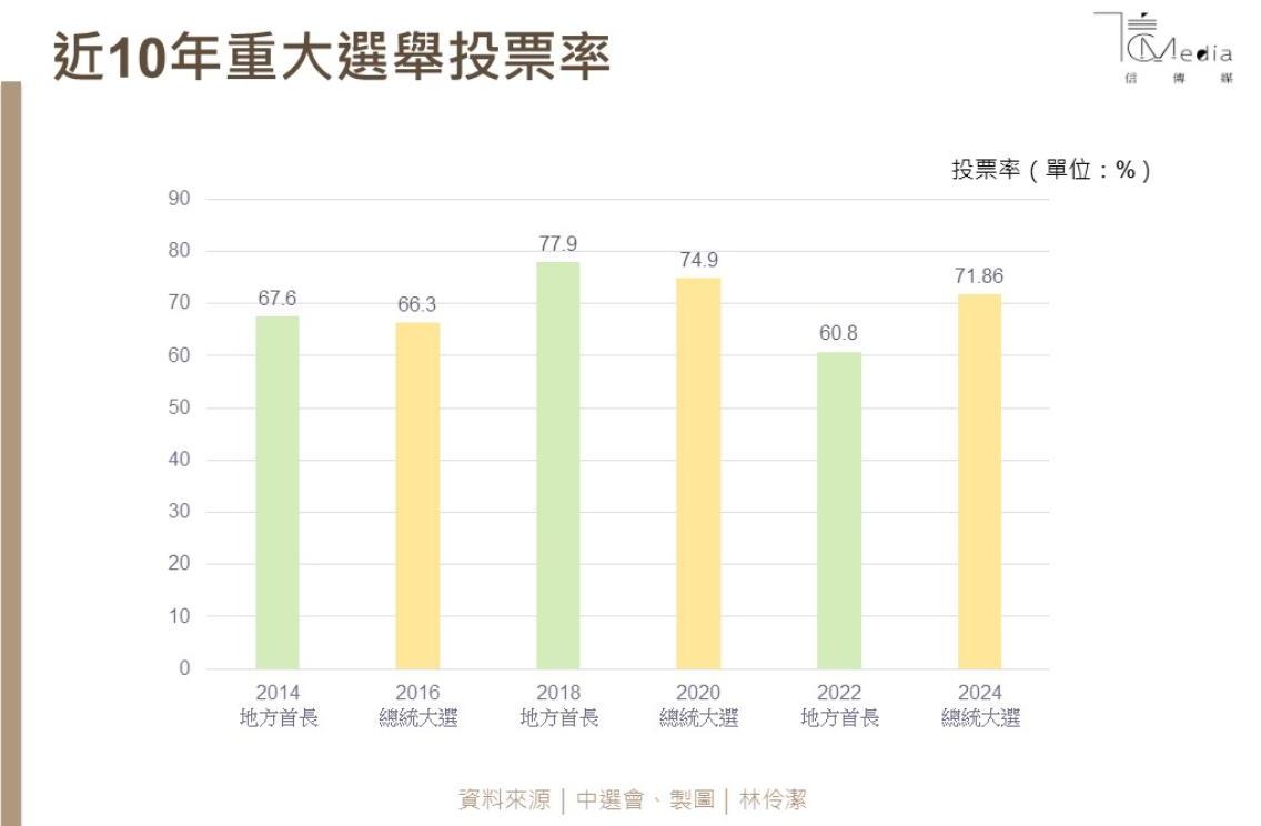 今日天氣相當好,間接影響選民的投票意願,今年投票率達到71.86%。不過,在三腳督態勢下,柯文哲最終淪落「老三」,僅獲368萬餘票(約26.45%),無緣推倒藍綠高牆。民進黨賴蕭配獲得557萬餘票(約40.07%)、國民黨侯康配466萬餘票(約33.46%)