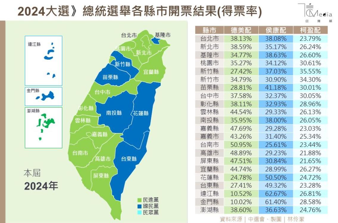 至於新北市各候選人得票數,賴清德得票數居冠,即便選前出現賴皮寮爭議,仍然擋不住新北子弟的優勢;侯友宜得票數位居第二,象徵市政成績仍受部分市民肯定,相信警察出身的他能帶領好台灣;柯文哲則位居第三,青年得票數不如預期。