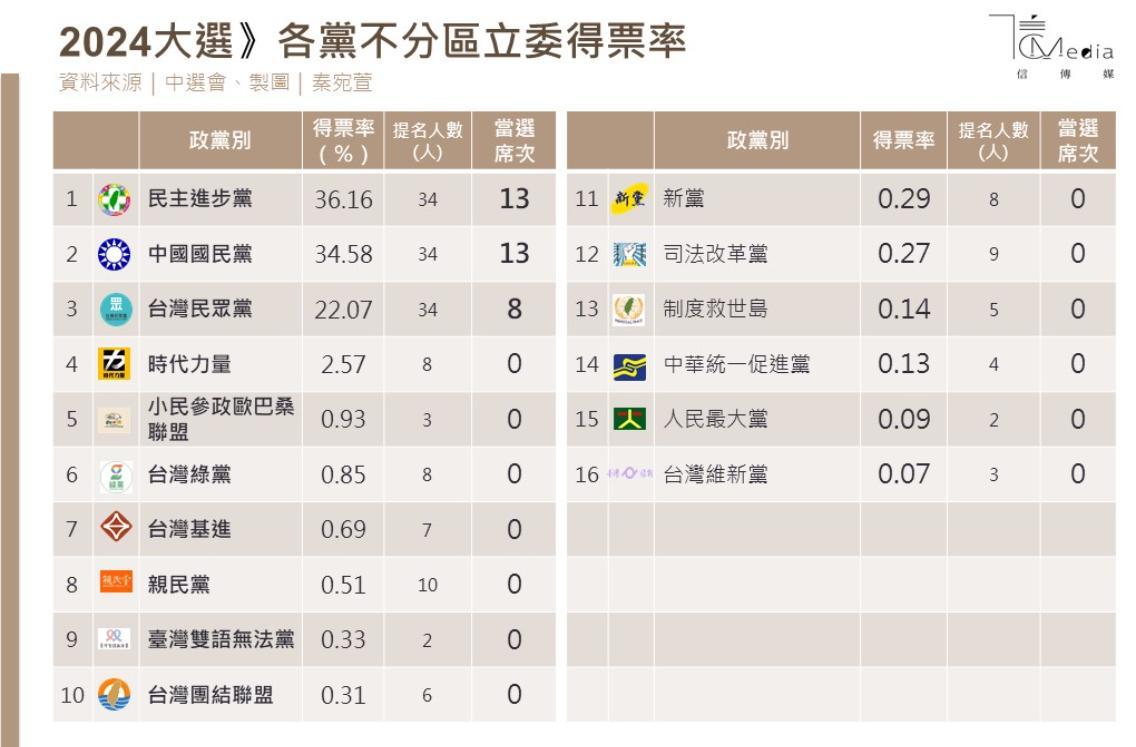 民眾黨最終政黨票數不如預期,甚至柯文哲獲得的總統票都比民眾黨獲得的政黨票來得多,僅獲303萬餘票(約22%)拿下國會基礎的8席位置,沒有成功往兩位數目標邁進。不過,民眾黨在2020年全國不分區及僑居國外國民立法委員選舉的得票率為11.22%、獲5席,整體來說也是有進步。