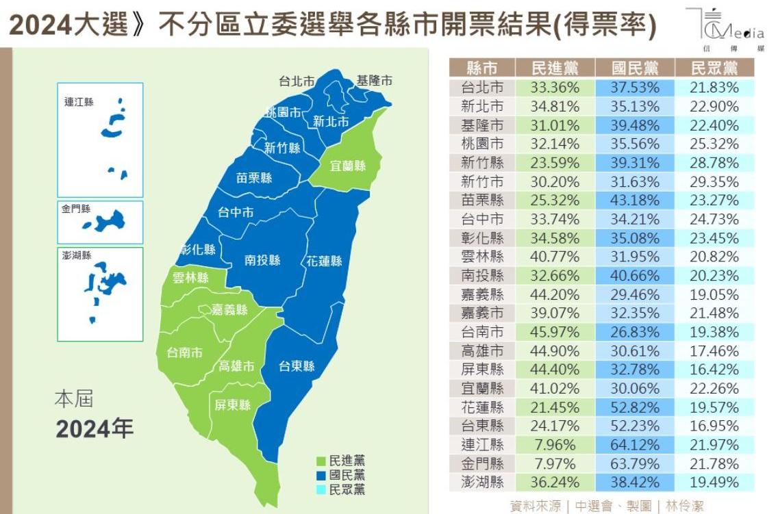 民眾黨派出的11位區域立委候選人全軍覆沒,包含現任立委張其祿選台北市第8選區(文山、中正)、現任立委邱臣遠選新北市第8選區(中和)、現任立委賴香伶選桃園市第5選區(平鎮、龍潭)、立委陳琬惠選宜蘭縣,前立委蔡壁如出戰台中市第1選區(大甲、大安、外埔、清水、梧棲)。