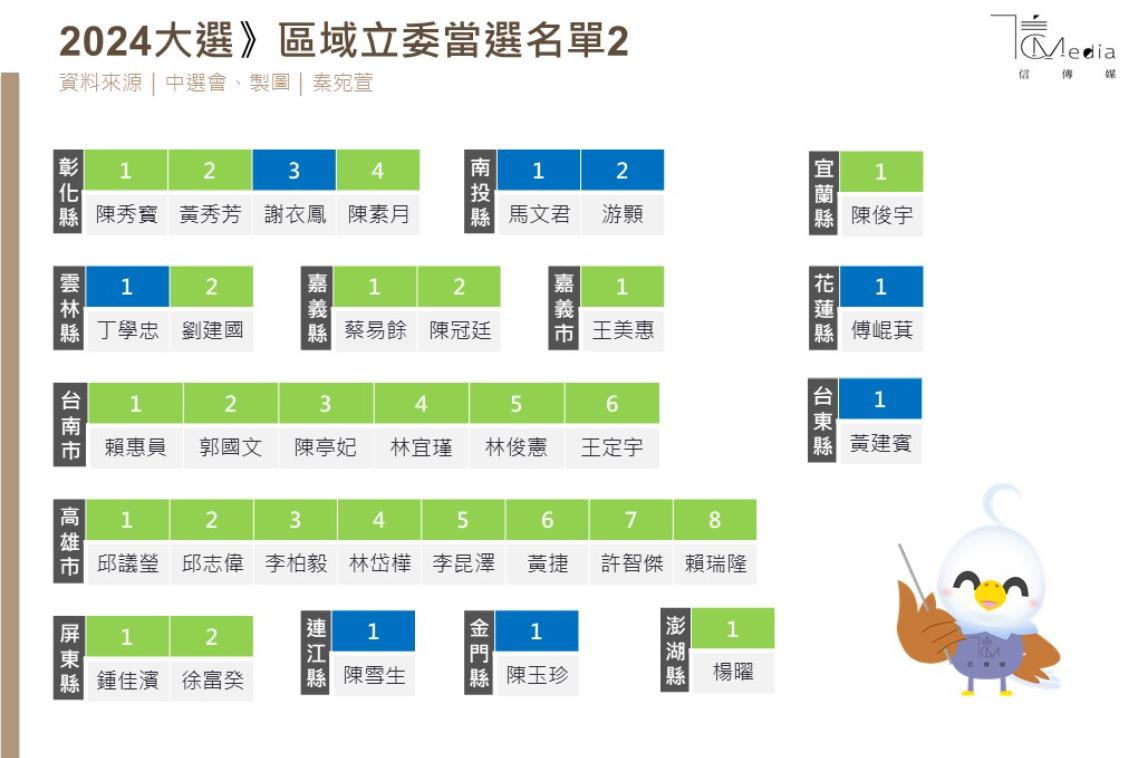 根據中選會公布的政黨票選舉結果,民進黨獲得36%、國民黨獲34%、民眾黨獲22%,最後席次分配:國民黨與民進黨將分別獲13席,民眾黨拿下8席,民進黨不分區第13位王正旭,則因婦女保障席次讓位給第15名的現任立委陳培瑜。