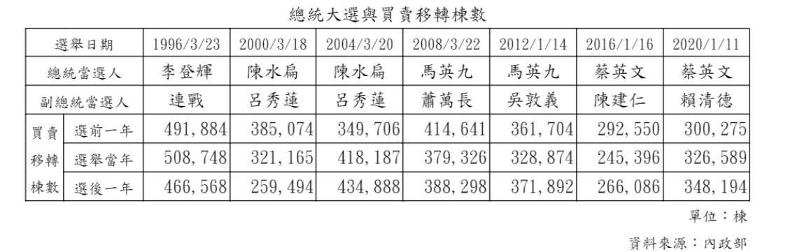通常總統大選前半年通常會讓國人注意力集中於選戰,不過根據內政部數據,過去7次總統大選中,僅3次選前一年的買賣移轉棟數低於選舉當年,近幾年房市受衝擊最深的原因,除了1997年金融風暴,莫過於房地合一1.0,從2015年預告上路到2018年,連續4年都不到30萬棟。