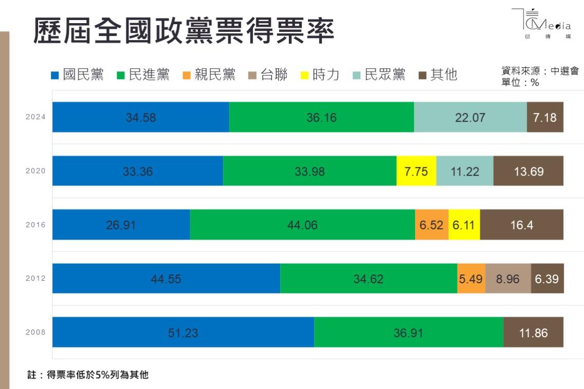2024大選,34席不分區立委,由傳統藍綠兩大黨,及創黨僅4年的民眾黨囊括,其餘小黨均無法跨過5%門檻,未能取得席次,全軍覆沒。