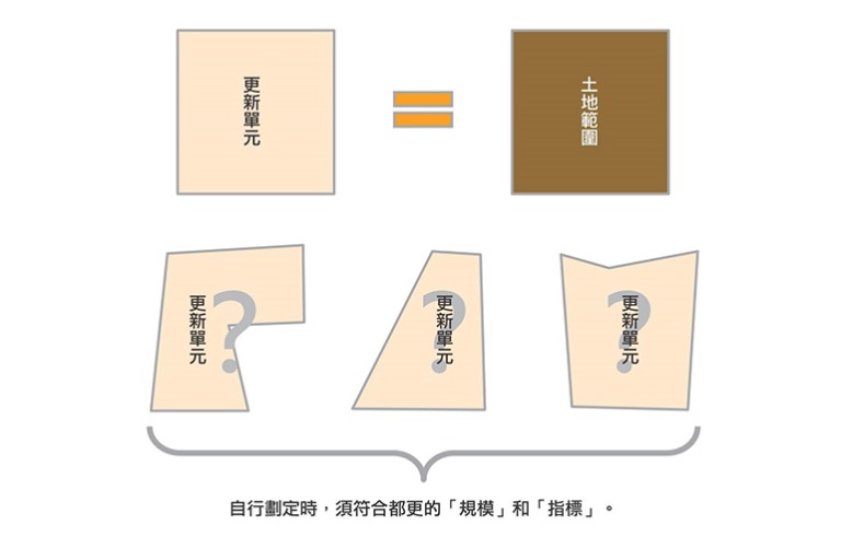 都市更新條例中,「更新單元:係指更新地區內可單獨實施都市更新事業之分區。」換句話說,更新單元就是申請實施都市更新重建或整建維護的土地範圍。