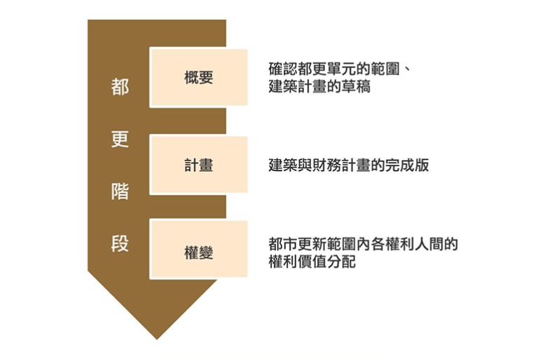 一般土地要開發建築,只要經過土地內的人同意即可;但如果想要擁有都市更新的權利,也就是拿到進入都更大門的入場券,就必須經過都市更新流程的審核。都市更新流程可以分成: