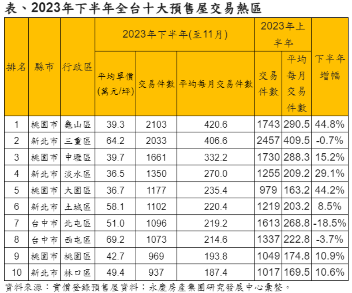 《平均地權條例》修正條文於2023年7月1日施行,新法上路後禁止預售屋、新建成屋換約轉售等行為,預售屋交易回歸供需基本面,以自住、長期置產為交易主力。永慶房產集團統計預售屋實價登錄資訊,2023年下半年揭露至11月,預售屋交易最熱門的十個行政區由新北、桃園、台中三都包辦,其中以桃園市龜山區2103件居冠,新北市三重區2033件居次,桃園市中壢區1661件第三。