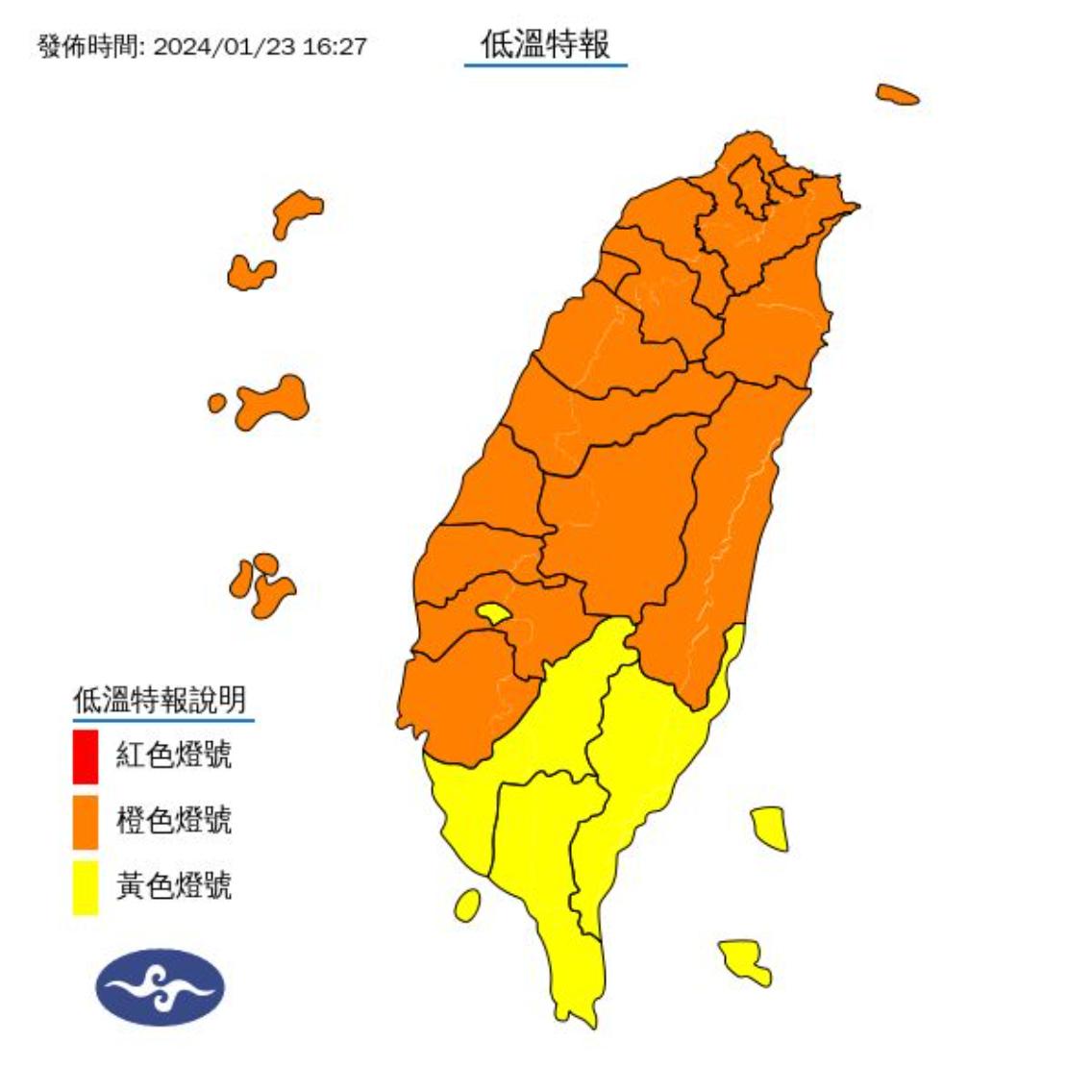 全台多地都亮起代表「非常寒冷」的橙色燈號。(圖片來源/FB@報天氣 - 中央氣象署)