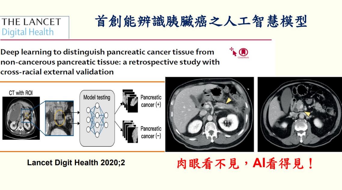 「台大醫院內科、影像醫學科和台灣大學研究團隊共同努力,開發出全球首創能辨識胰臟癌的人工智慧模型,在此模型中能檢測出醫師肉眼看不到的胰臟癌,偵測率高達9成,這項成果也刊載於影像醫學頂尖期刊《Radiology》並獲得國際影像醫學最重要的學會RSNA,選為2023年影像醫學界最重要的研究(Margulis Award)。」廖偉智提到。