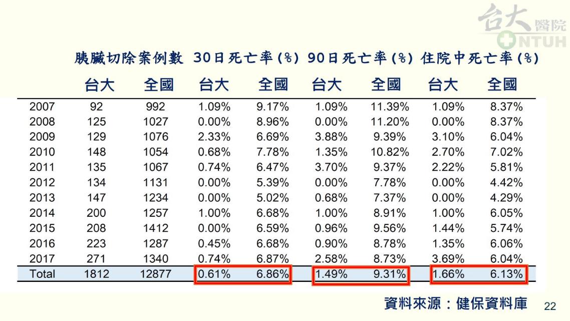 台大醫院一般外科主任、胰臟癌手術權威田郁文指出,「單以胰頭十二指腸切除術(也稱惠普氏手術),台大醫院近5年每年的平均死亡率是0.74%,這個數目比美國約翰霍普金斯醫院、美國維基尼亞大學醫院、日本橫濱大學醫院、美國哈佛醫學院都有過之而無不及。」