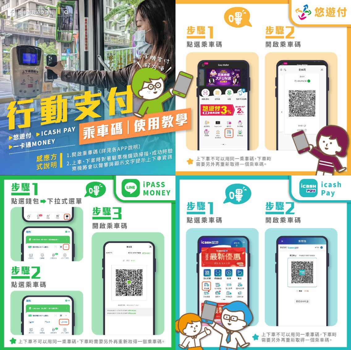 現在可以使用的有悠遊付、一卡通 MONEY與ICASH PAY的QR-code乘車碼功能,提供民眾更多元的行動支付乘車選項。民眾上下車只要開啟行動支付APP,點選乘車碼再將手機QR Code對準驗票機設備的鏡頭,完成掃描後即可上下車,省去翻錢包找零錢或電子票證卡片的困擾。