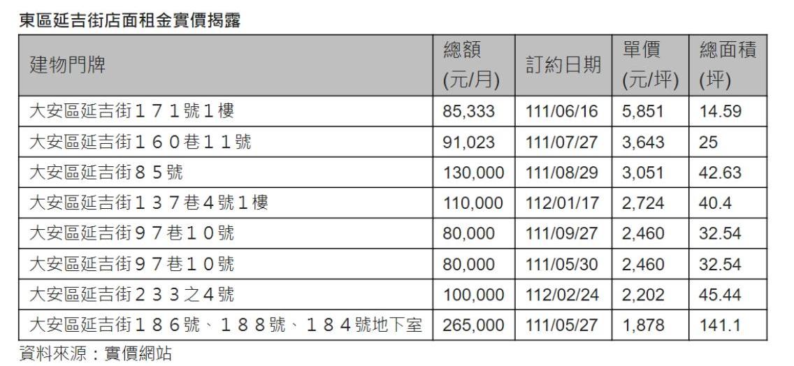 北市延吉街是台北市東區重要的餐飲戰區,不過路段的租金差異也很大,近期成為市場焦點的海鮮店,就位處東區商圈的邊陲,對面去年2月實價揭露每坪租金2202元,月租10萬元,不過同樣延吉街的店面實價揭露,有小店店租每坪可達5851元,越靠近忠孝東路的路段租金水準越高。