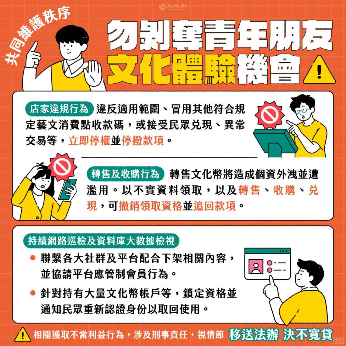 文化部表示,會持續透過網路巡檢及資料庫大數據檢視,自1月20日開放領用以來,已主動查獲數間違規店家,包含不符合適用資格的店家,如美妝用品、美甲等冒用其他符合規定藝文消費點收款碼,或接受民眾兌現、交易異常等,皆已於前幾日立即停止適用資格,並停止撥款,拍立得的部分也已經公告於1月25日21時之後,不得再使用文化幣購買拍立得。