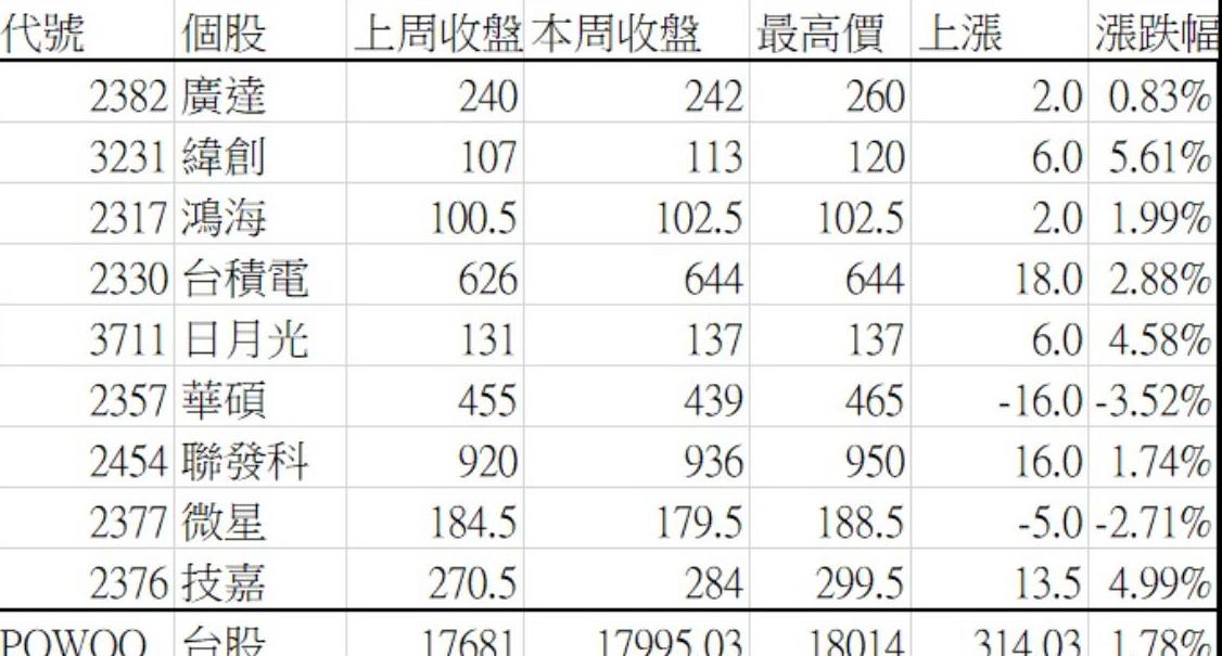 技嘉26日下跌8元,收在284元,然而這禮拜技嘉是從上周收盤270.5元、本周自282元跳高開出,一周內上漲13.5元,本周漲幅4.99%。至於廣達雖然26日下跌7元,收在242元,跌幅2.81%,但一周下來也是漲了0.83%,還一度觸及260元的近期新高。