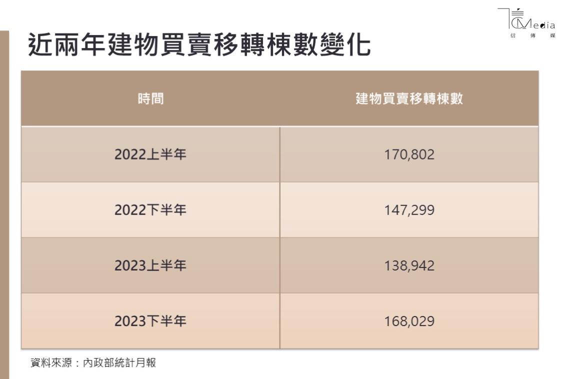 若以2022與2023上下半年來比較,2023上半年的建物買賣移轉棟數13.9萬棟,年減達19%,不過2023下半年建物買賣移轉棟數增加到19.4萬棟,反而年增拉高達14%,反映下半年交易市況熱絡。