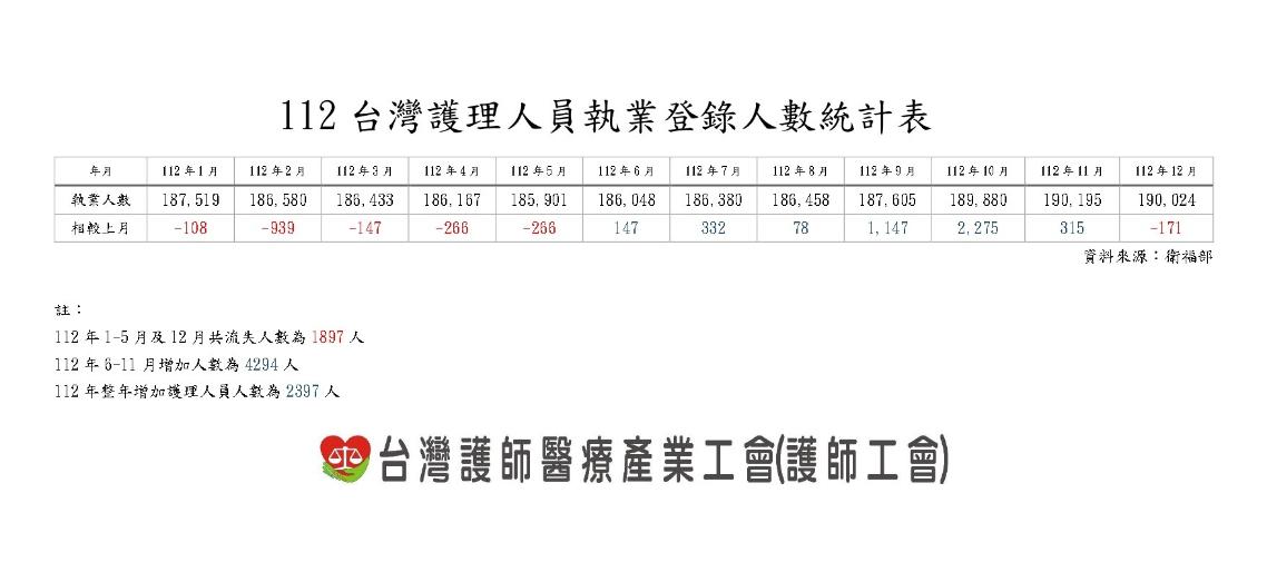 而衛福部在新聞稿中提到,截至112年12月底護理執業人數19萬24人,相較於112年1月底執業人數18萬6,580人,增加3,444人。「實際上以整年度來說,1-5月及12月流失1,897人、6-11月增加4,294人,因此僅增加2,397人。」