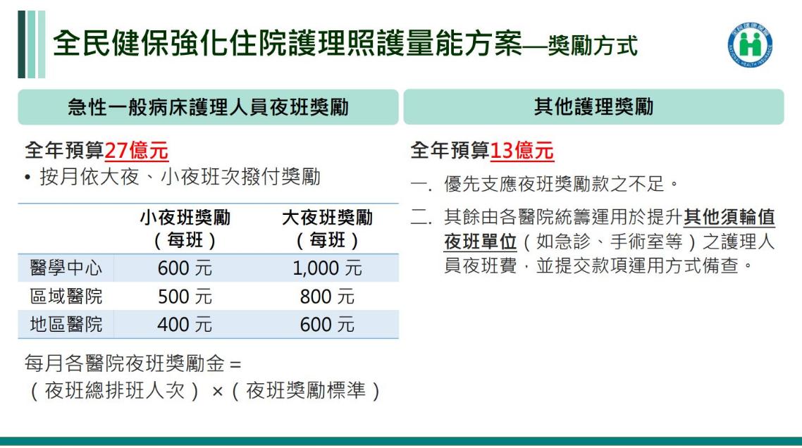 專款將運用於醫院輪值夜班護理人員獎勵,其中27億元挹注於急性一般病床夜班護理人員,並依護理人員大夜、小夜排班班次發給獎勵金,小夜班每班獎勵400-600元、大夜班每班獎勵600-1,000元,由健保署按月撥付款項;其餘13億元則由醫院統籌運用於提升院內其他須輪值夜班單位之護理人員夜班費。