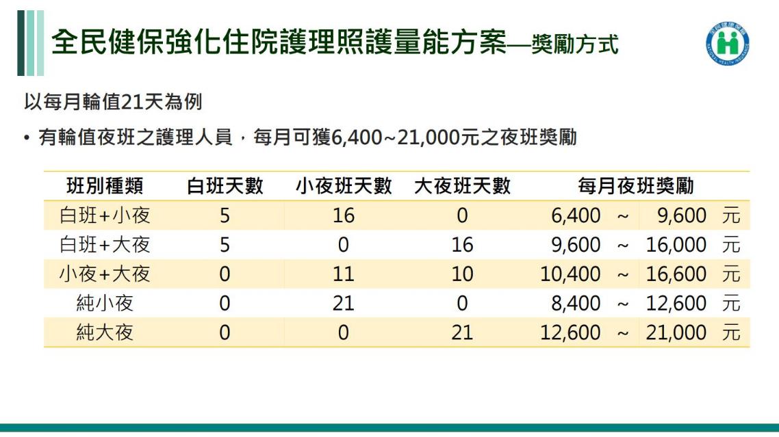 2. 為扣合協定事項之「優先用於強化住院夜班護理照護量能」,以白班權重為2、大(小)夜班權重各為4之加權方式計算獎勵金額。
