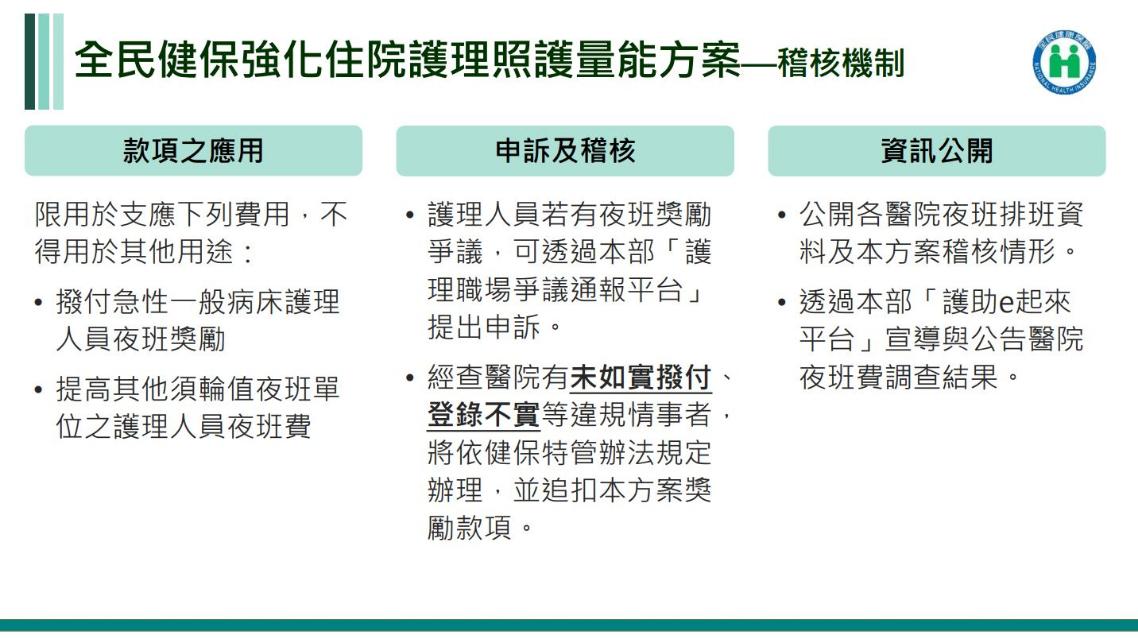 薛瑞元也提到,為鼓勵醫院護理人員留任並提升輪值夜班意願,衛福部於113年全民健保總額之其他預算,編列「因應醫院護理人力需求,強化住院護理照護量能」專款項目40億元,優先用於強化住院夜班護理照護量能。