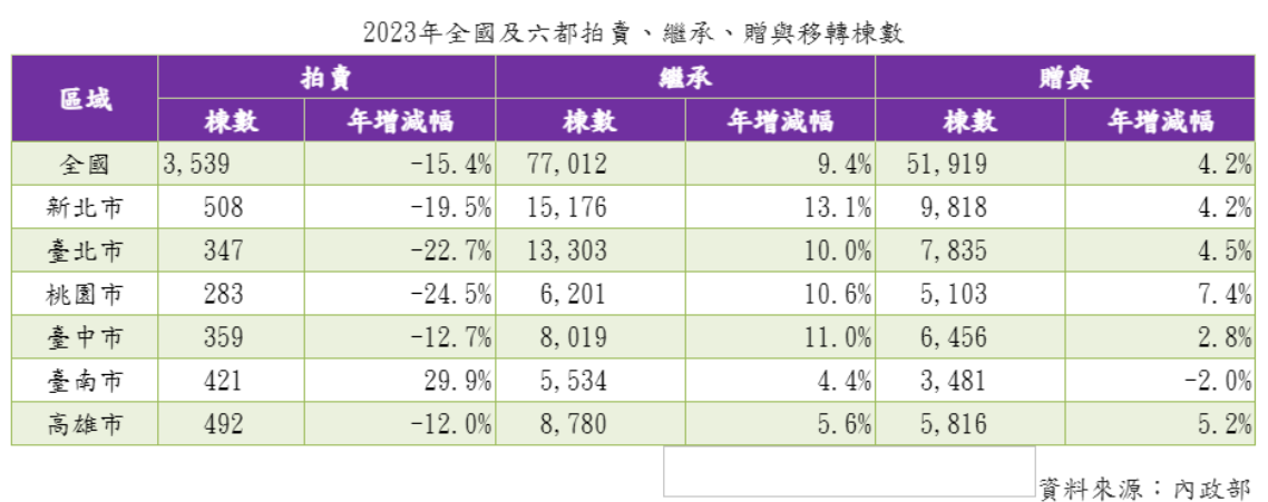 去年房市交易量緊縮,拍賣移轉跟著下滑,繼承移轉持續增加,贈與移轉也上揚,去年全國贈與移轉51,919棟、年增4.2%,至於六都的各項數據表現,繼承移轉六都全面增加,人口最多的新北市無論是拍賣、繼承或贈與都是最大量,其中繼承移轉幾乎是台南市的三倍,不過台南市在拍賣移轉跟贈與移轉的走勢都跟其他五都不同,台南市拍賣移轉不僅是唯一上揚,甚至大增29.9%。
