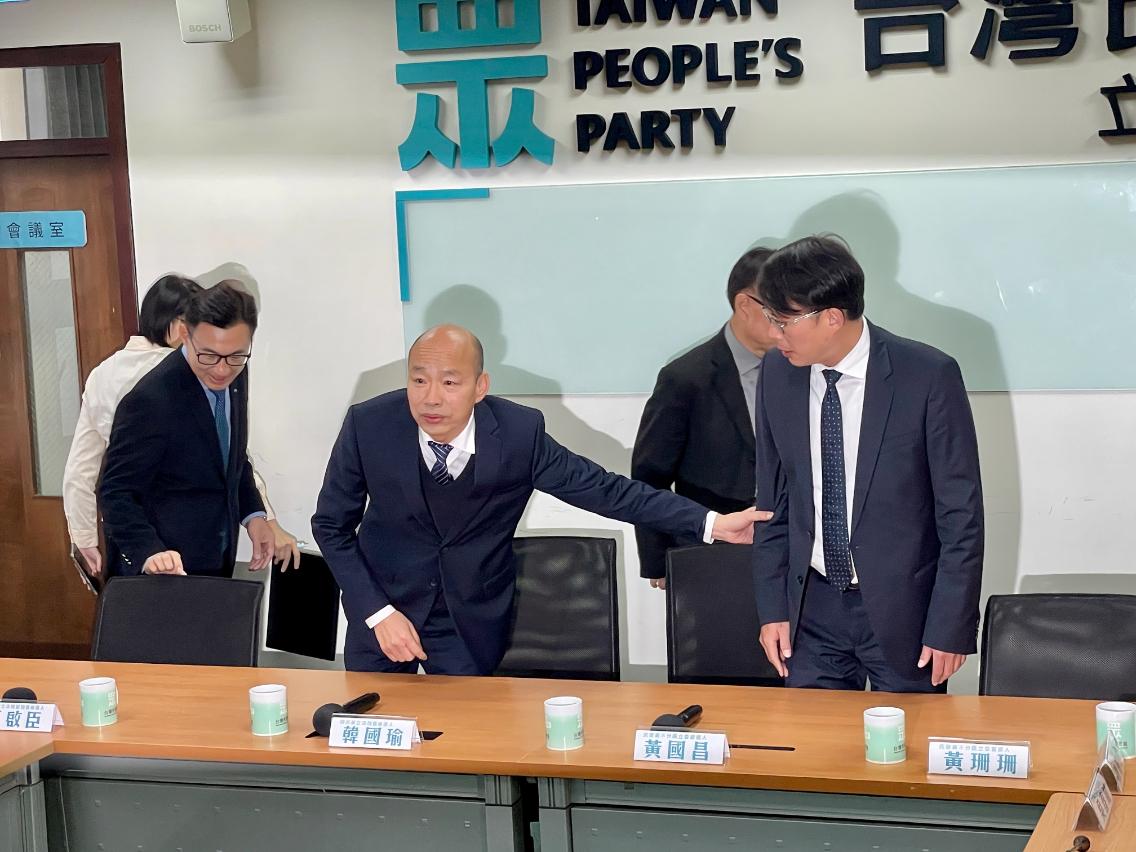 媒體問及,跟民眾黨談合作,有想過會有今天嗎?韓國瑜表示,今天的主人是民眾黨,「不問一下民眾黨嗎?問一下黃國昌委員?」黃國昌表示,韓國瑜及江啟臣可以說是國民黨現在國會的領袖,今日來民眾黨拜訪,也如同韓國瑜剛才所說,這是一場非常健康且良性的互動,絕對沒有外界形容的私設刑堂或密室交換。