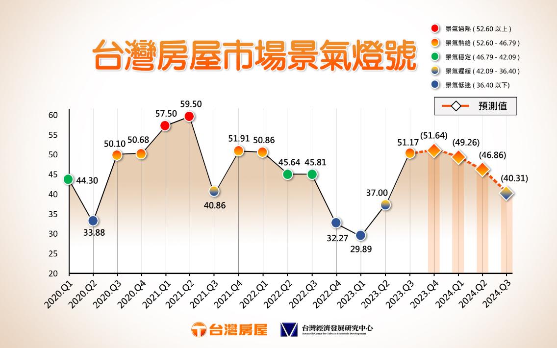 台灣房屋集團與中央大學台灣經濟研究發展中心,發佈最新「台灣房屋市場景氣燈號」及房市景氣預測,今年Q1預測指標分數為49.26,Q2則是46.86,因此2024上半年,均為代表景氣熱絡的黃紅燈;到了Q3預設指標分數略降至40.31,轉為象徵遲緩的藍黃燈,意味今年下半年景氣可能浮現放緩跡象。總體來說,台灣房屋市場景氣燈號於2023年H1觸底反彈後,預測結果從2023年Q3起連續四季亮起黃紅燈,市場展望平穩。